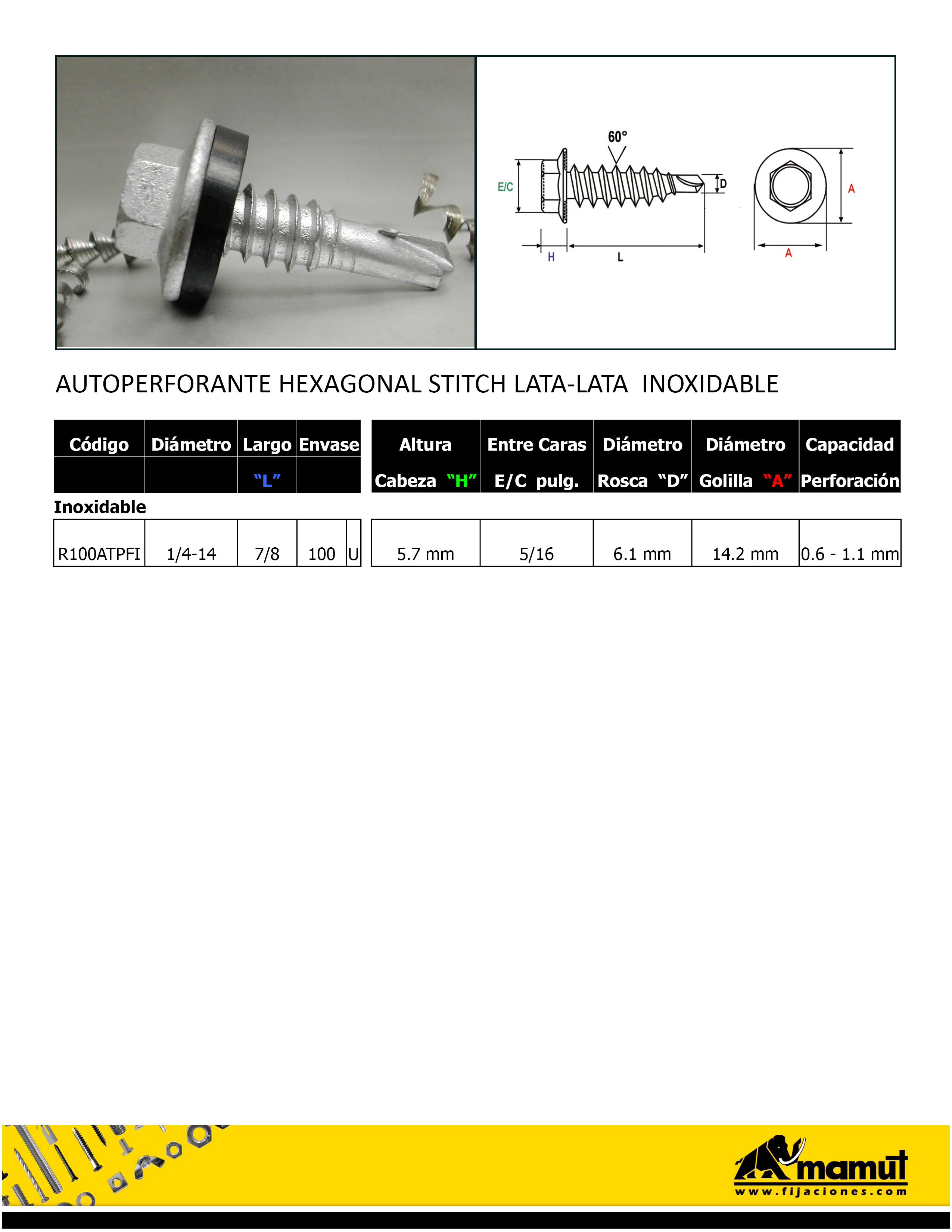 AUTOPERFORANTE HEXAGONAL STITCH LATA-LATA PTA. BROCA INOXIDABLE.